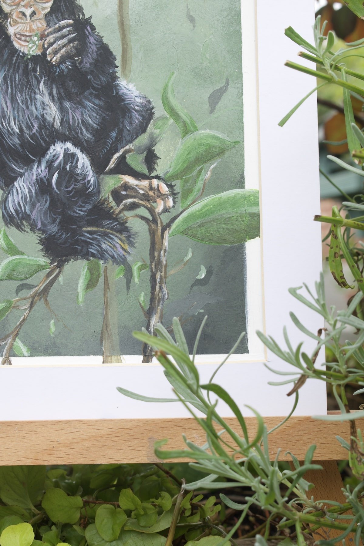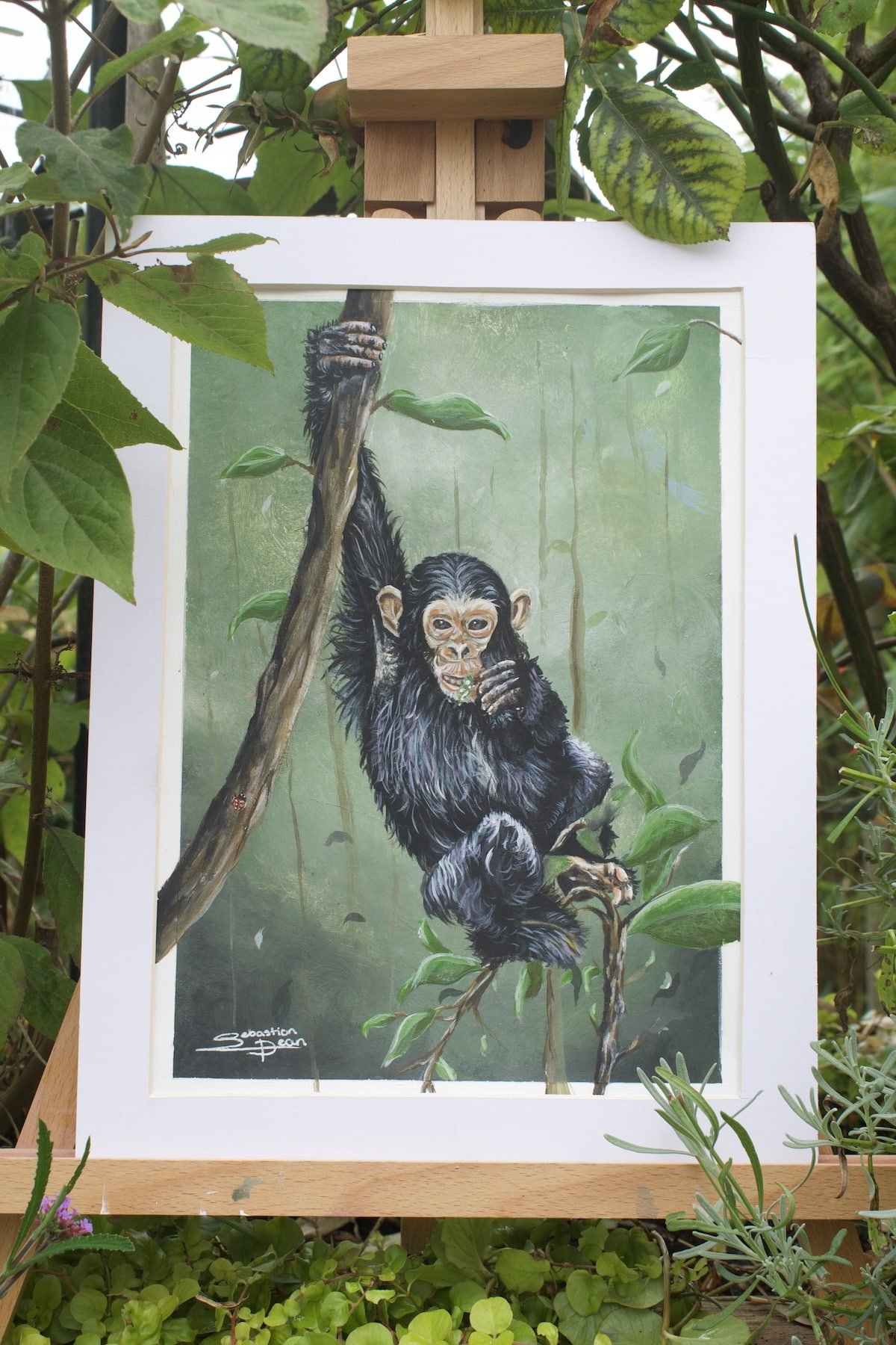 An acrylic portrait of a chimpanzee, blending strength and sensitivity in a textured expression of character.